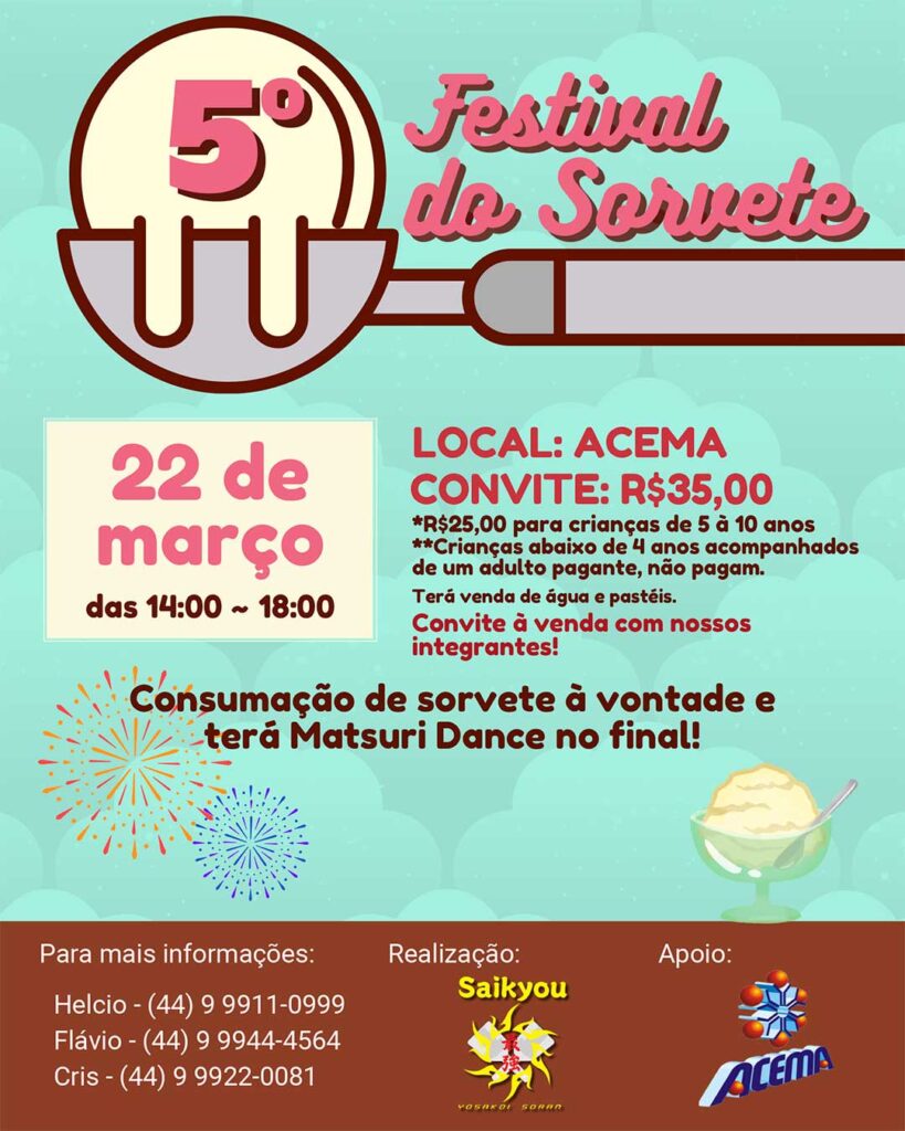 CONSUMAÇÃO DE SORVETE À VONTADE E TERÁ MATSURI DANCE NO FINAL