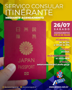 O Consulado Geral do Japão em Curitiba realizará o próximo atendimento itinerante em Maringá/PR. ❗ O serviço irá se limitar aos que efetuarem agendamento prévio,…